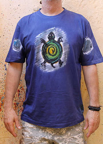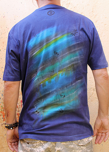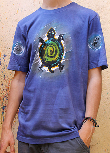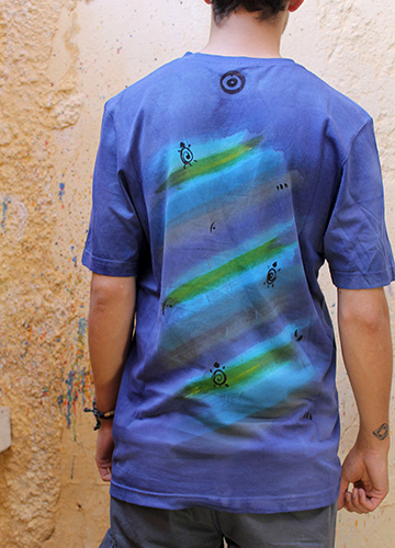 Silkscreen printed by hand and hand-painted. This means that the colours may vary a bit from T-shirt to T-shirt.